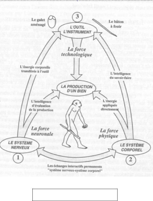 Le dessin de la page suivante donne une illustration du démarrage de l’humanité par l’homme préhistorique, la force technologique étant constituée par le galet aménagé et le bâton à fouir.
